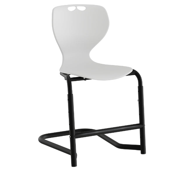 Skolestol Tarris med hvid sæde og understel i pulverlakeret sort RAL9005. Den har fodstøtte og justerbar siddehøjde 450-630 mm.