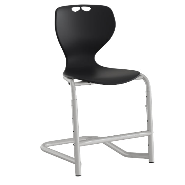 Skolestol Tarris med sort sæde og understel i pulverlakeret alugrå RAL9006. Den har fodstøtte og justerbar siddehøjde 450-630 mm.