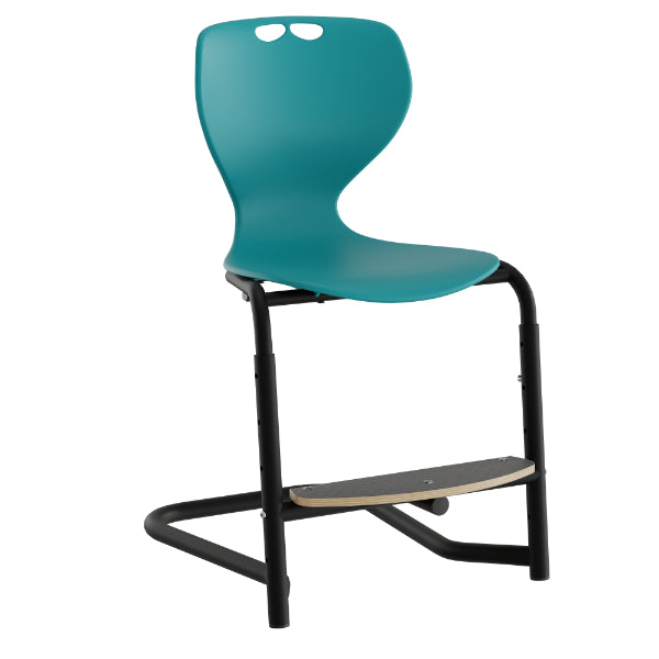 Skolestol Tarris med turkis sæde og understel i pulverlakeret sort RAL9005. Den har fodplade og justerbar siddehøjde 450-630 mm.