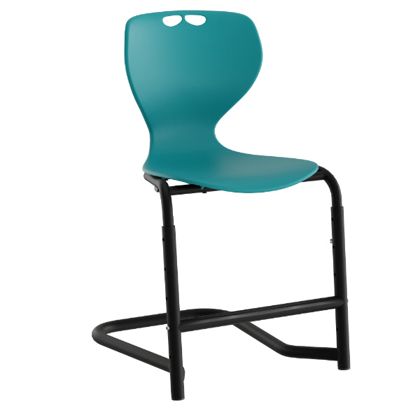 Skolestol Tarris med turkis sæde og understel i pulverlakeret sort RAL9005. Den har fodstøtte og justerbar siddehøjde 450-630 mm.