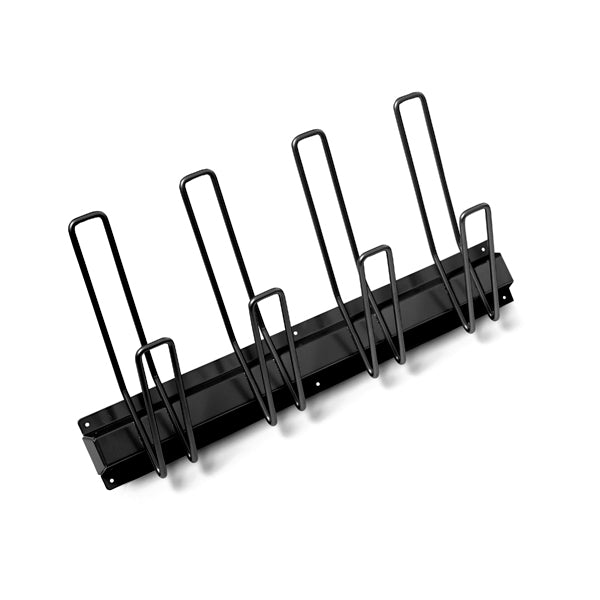 Støvleophæng med dobbelt bøjler til ophæng af sko/støvler. Pulverlakeret metal i sort, RAL 9005. 4 bøjlesæt. Højde lang bøjle 260 mm og højde kort bøjle 185 mm. Et bøjlesæt pr 150 mm i bredden. Dimensioner mm (b x d x h) 600 x 170 x 330. Endeafslutning følger ikke med, da flere ophæng kan monteres sammen, og endeafslutninger skal derfor bestilles separat.