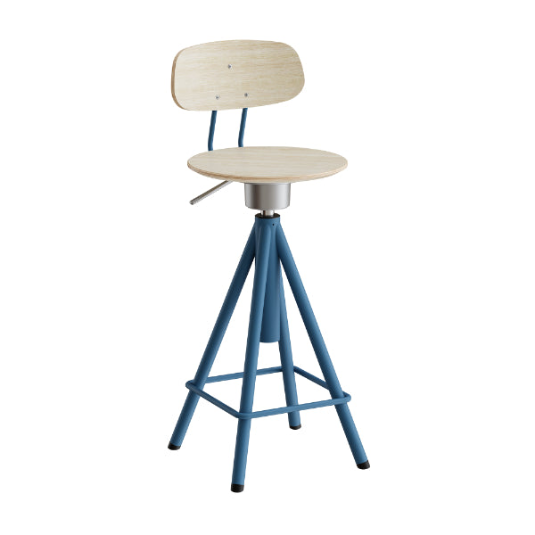 Taburet Atlas med ryg i lakeret stålstel og sæde belagt med højtrykslaminat i hvidpigmenteret eg. Hæve-sænkbar med gasregulering og vippefunktion for at få bedst mulig ergonomi. Passer godt til bordet i Atlas serien.