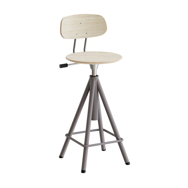 Taburet Atlas med ryg i lakeret stålstel og sæde belagt med højtrykslaminat i hvidpigmenteret eg. Hæve-sænkbar med gasregulering for at få bedst mulig ergonomi. Passer godt til bordet i Atlas serien.