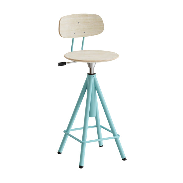 Taburet Atlas med ryg i lakeret stålstel og sæde belagt med højtrykslaminat i hvidpigmenteret eg. Hæve-sænkbar med gasregulering for at få bedst mulig ergonomi. Passer godt til bordet i Atlas serien.
