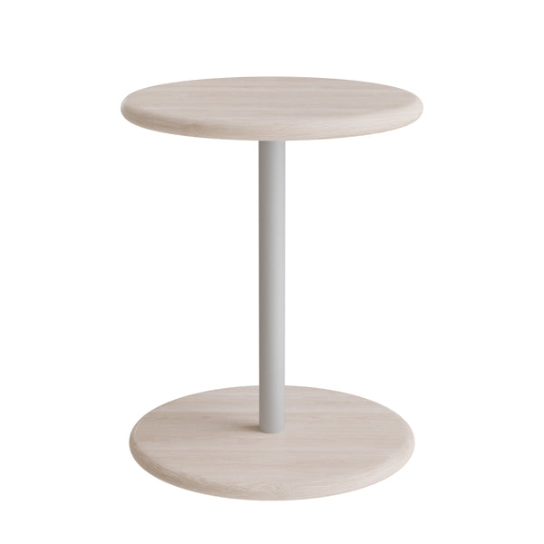 Taburet Donut med søjleunderstel og solid fod i stål. Sæde i massiv hvidpigmenteret ask med bløde afrundede kanter.