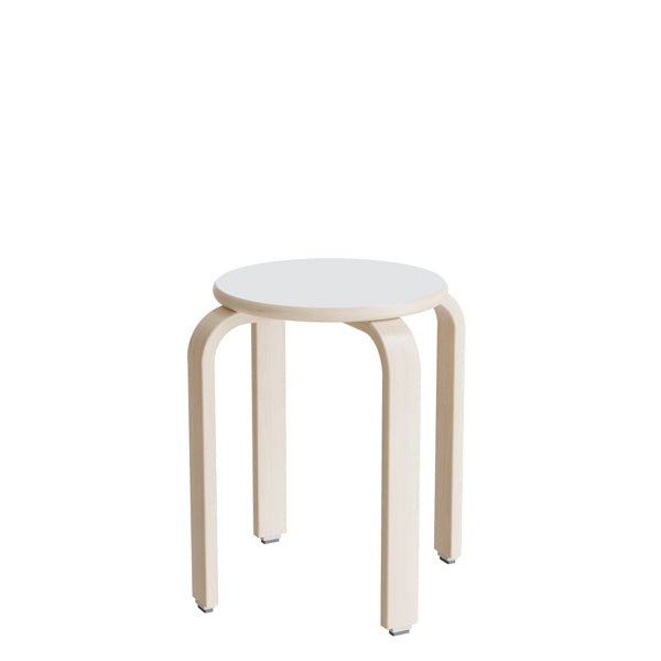 Taburet Oscar med ben i hvidpigmenteret birkefinér. Rundt sæde Ø330 (Ø448 mm med ben) belagt med slidstærk højtrykslaminat. Levereres med filt gulvbeskyttelse.Specifikationer: