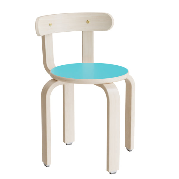Taburet Oscar har ben i hvidpigmenteret birkefinér og et rundt sæde med slidstærk højtrykslaminat i turkis.