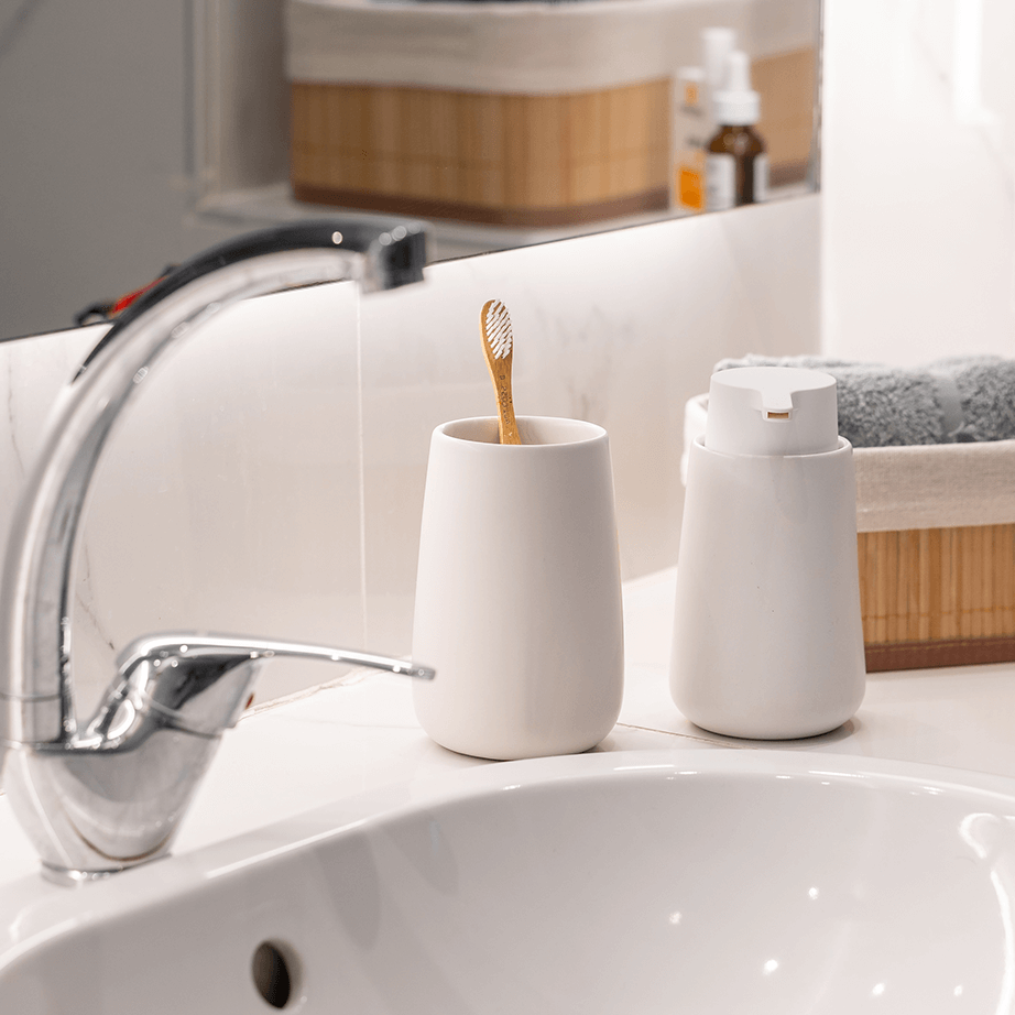 Tandkruset er fremstillet i slidstærk keramik og står stabilt på vasken uden at vælte. Det er ideelt til opbevaring af tandbørster, makeupbørster eller andre småting, og passer perfekt sammen med de øvrige produkter i Fjord-serien – herunder sæbedispenseren i samme design.