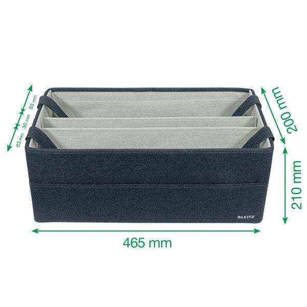 Føl dig hjemme, uanset hvor din dag fører dig hen, med opbevaringsserien i stof fra Leitz. Med det minimalistiske design og den indbydende matte fløjlsgrå finish kan du være stilfuld og samtidig holde orden på kontoret, derhjemme og alle steder derimellem. Leitz Hot Desking arbejdstasken i stof har tre separate rum, som giver dig mulighed for at opbevare og bære alt, hvad du har brug for til den kommende dag. Denne moderne og praktiske opbevaringstaske har plads nok til en bærbar computer, tastatur, mus, ladekabel, headset, notesbog og en vandflaske. Fremstillet af blødt materiale, som er forstærket med genbrugspap for styrke og holdbarhed. I alt 57% genanvendt indhold. Når den ikke er i brug, kan den foldbare opbevaringsboks foldes helt sammen, så den nemt kan gemmes væk. Denne hot desk-taske med bærehåndtag er den perfekte tilføjelse til dit hjem eller kontor for at sikre, at du forbliver afslappet og produktiv hele dagen. - Foldbar opbevaringstaske til hot desking, ideel til at ho