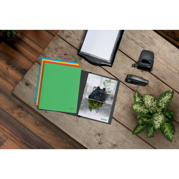 Oplev Leitz' iøjnefaldende tilbudsmappe af premium kvalitet, der kombinerer bæredygtighed med funktionalitet. Denne praktiske mappe er fremstillet af 100% recirkuleret karton og er Blå Engel-certificeret, hvilket gør den både miljøvenlig og elegant.