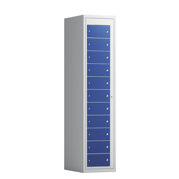 Tøjudleveringsskab 1x11 rum med lige tag og blå døre med cylinderlås