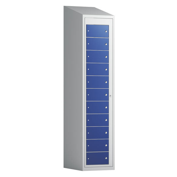 Tøjudleveringsskab 1x11 rum med skråt tag og blå døre med cylinderlås