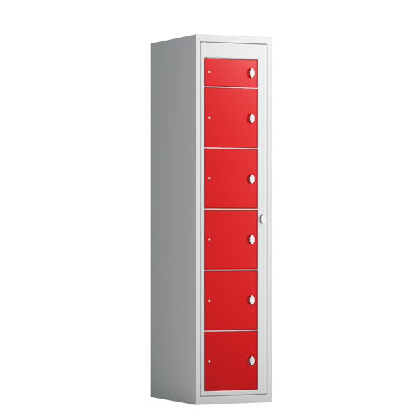 Tøjudleveringsskab 1x6 rum med lige tag og røde døre med greb f/hængelås