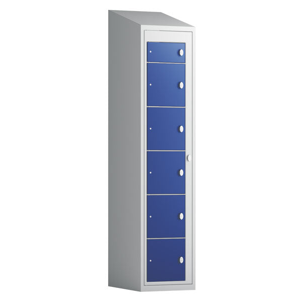 Tøjudleveringsskab 1x6 rum med skråt tag og blå døre med greb f/hængelås