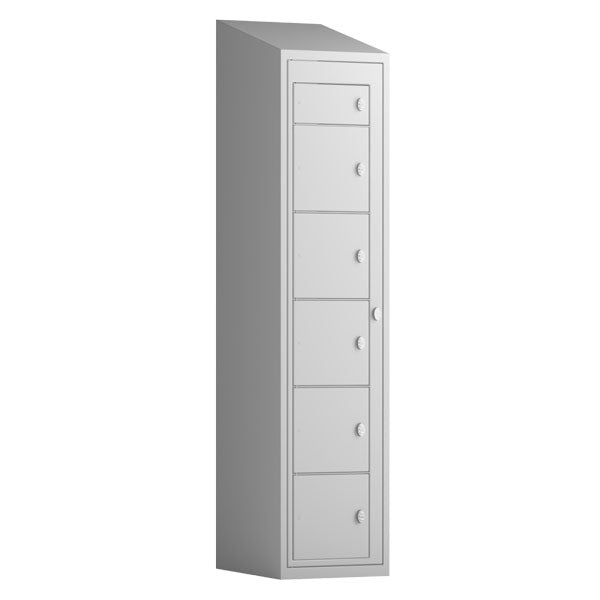 Tøjudleveringsskab 1x6 rum med skråt tag og lys grå døre med greb f/hængelås