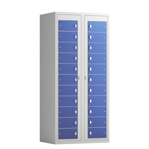 Tøjudleveringsskab 2x11 rum med lige tag og blå døre med greb f/hængelås