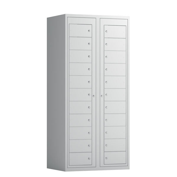 Tøjudleveringsskab 2x11 rum med lige tag og lys grå døre med cylinderlås