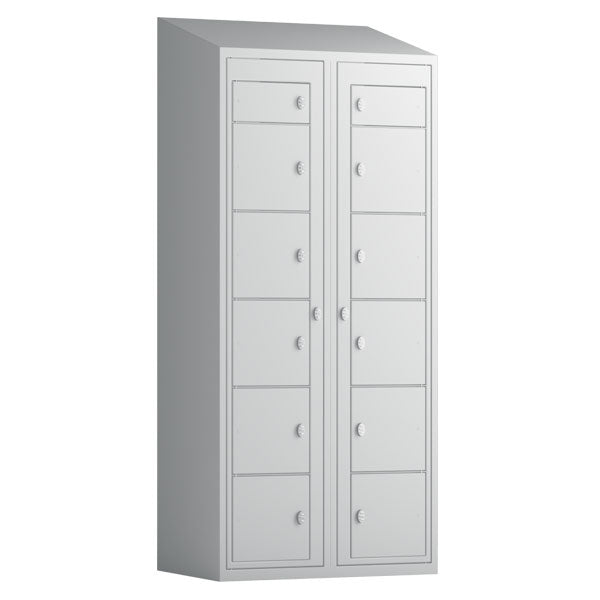 Tøjudleveringsskab 2x6 rum med skråt tag og lys grå døre med greb f/hængelås