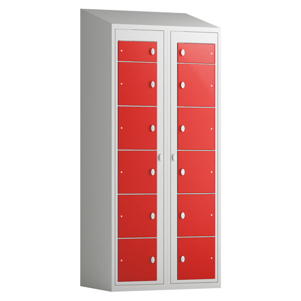 Tøjudleveringsskab 2x6 rum med skråt tag og røde døre med greb f/hængelås
