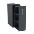 Møbelfakta certificerede towerskabe i DNA møbelserien, leveret i antracit laminat med hvide håndtag. Towerskabet har inderst et rum til tøjopbevaring, er med åbning til venstre (placeret til højre for skrivebordet) og har målene (bxdxh) 400 x 800 x 1200 mm.