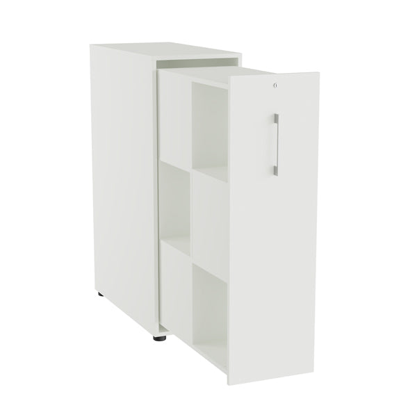 Møbelfakta certificerede towerskabe i DNA møbelserien, leveret i hvid laminat med alugrå håndtag. Towerskabet har seks indvendige rum, hvor bagsiden kan placeres til højre eller venstre, alt efter hvordan man ønsker at dele skabet op. Målene er (bxdxh) 400 x 800 x 1200 mm.