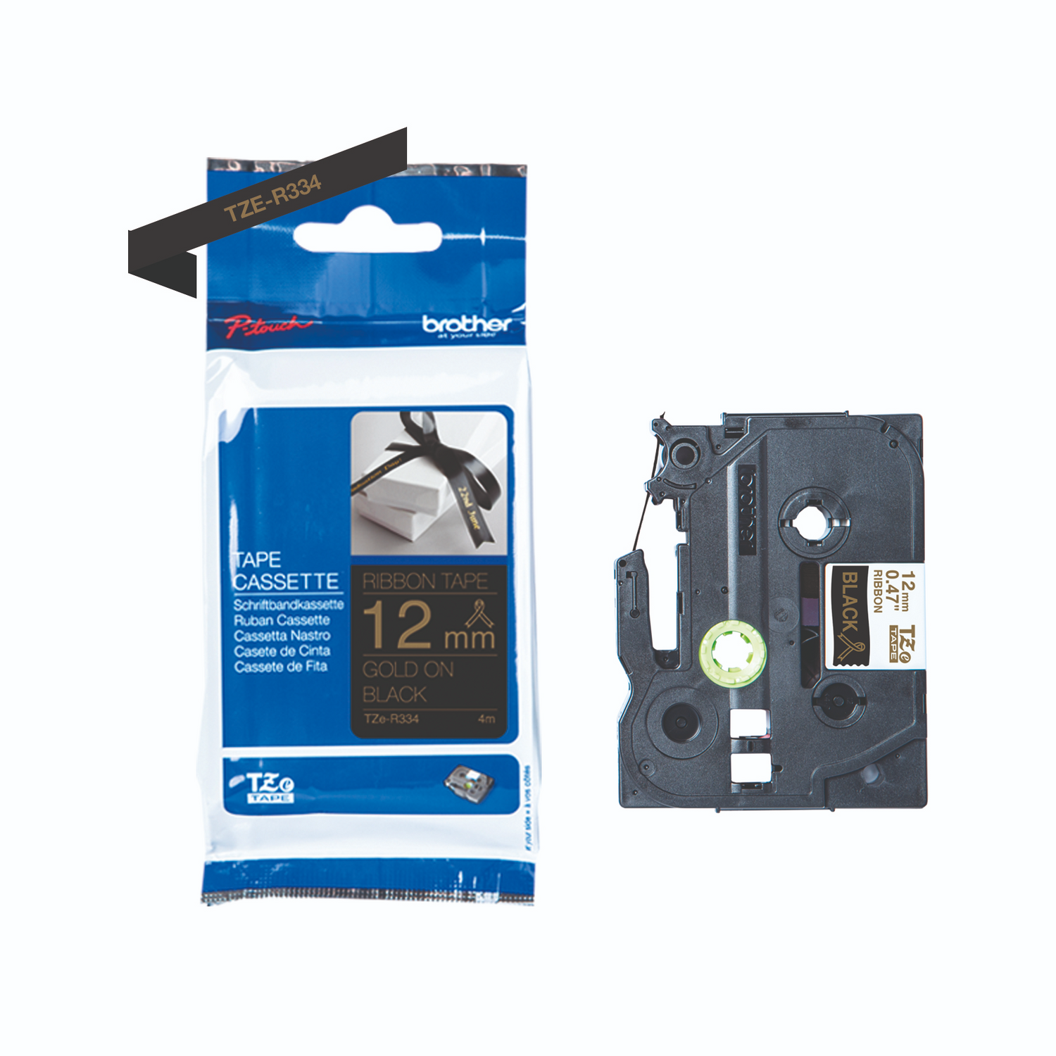 TZe-R334 printer guld tekst på sort 12m bånd