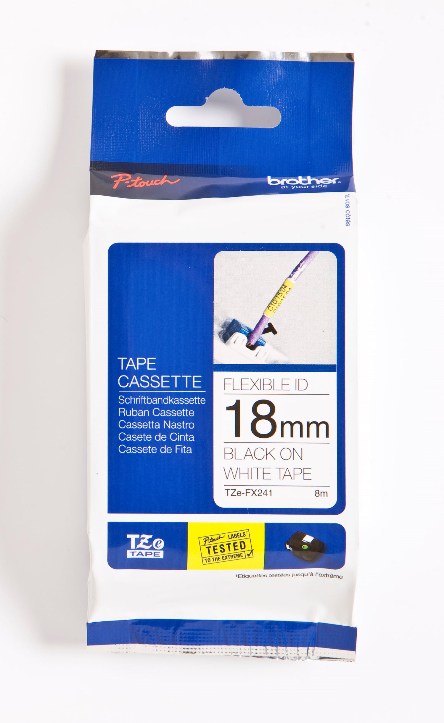 Original Brother TZeFX241 tape – sort på hvid, 18 mm bred. Det specielle klæbemiddel på Brother TZeFX241 sort på hvid-tapen er ideelt til fremstilling af identifikationslabels til kabler, ledninger, PVC-slanger eller andre ting, der er cylinderformet, og klæbemidlet sikrer, at dine vigtige labels bliver siddende i længere tid. Tapen passer til P-touch labelprintere, der har TZ- eller TZe-logoet på tapedækslet. Funktioner -18 mm bred, 8 m lang -Original Brother tape i høj kvalitet -Sikrer tydelige og holdbare labels