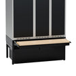 Komplet understel til garderobeskab med bredde 1000 mm og dybde 550 mm, inklusive benramme, udtrækkelig skuffe og udtrækkelig bænk. Understellet er testet og godkendt i henhold til standarden EN16121:2024, leveres i sortlakeret RAL9005-udførelse og med udtrækkelig bænk med laminatsæde. Benrammen har justerskruer til ujævne gulve, så højden kan indstilles mellem 438 og 478 mm. Dette kommer ud over skabets højde. Som udgangspunkt leveres understellet usamlet, men kan også leveres færdigsamlet mod et pristillæg.