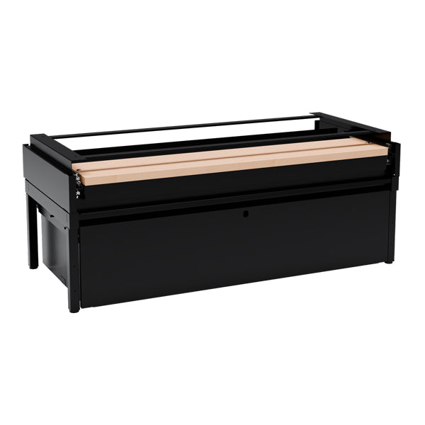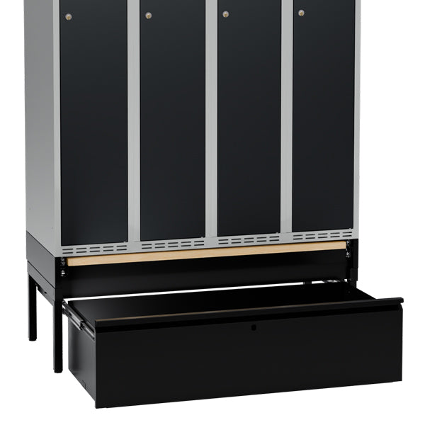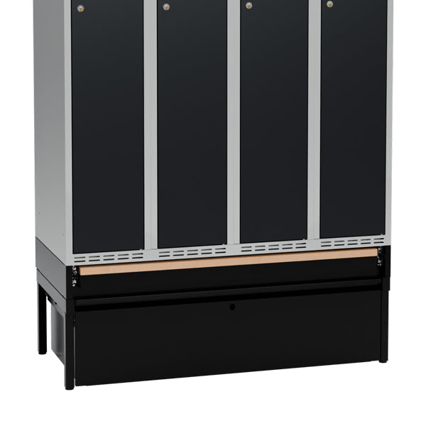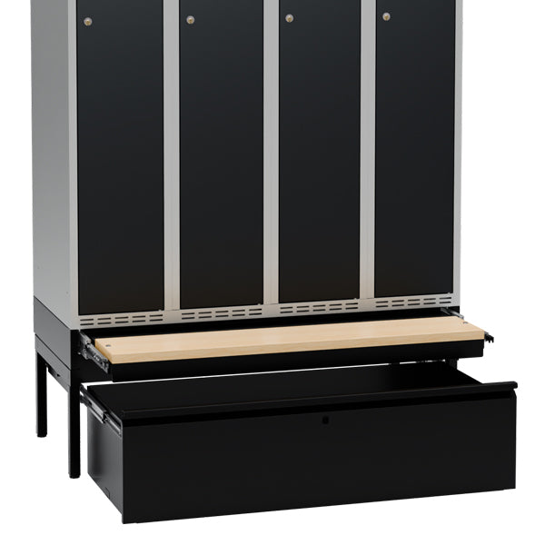 Komplet understel til garderobeskab med bredde 1200 mm og dybde 550 mm, inklusive benramme, udtrækkelig skuffe og udtrækkelig bænk. Understellet er testet og godkendt i henhold til standarden EN16121:2024, leveres i sortlakeret RAL9005-udførelse og med udtrækkelig bænk med laminatsæde. Benrammen har justerskruer til ujævne gulve, så højden kan indstilles mellem 438 og 478 mm. Dette kommer ud over skabets højde. Som udgangspunkt leveres understellet usamlet, men kan også leveres færdigsamlet mod et pristillæg.