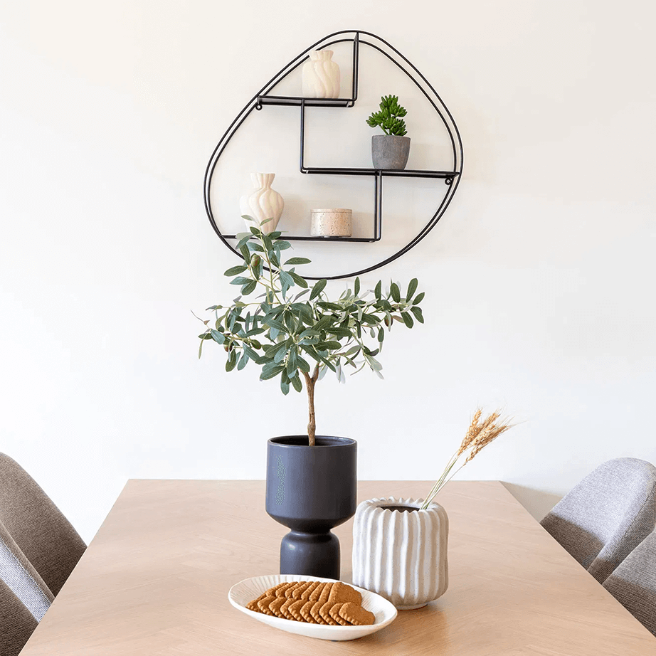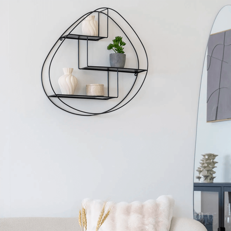 Sort væghylde i organisk form med 3 hylder Tilføj et stilfuldt og moderne element til dit hjem med denne væghylde. Den har en helt unik, organisk form og tre hylder til udstilling af små planter, vaser, lysestager eller andre dekorative genstande. Hylden er fremstillet af stål i en elegant sort farve, der passer perfekt ind i mange forskellige indretningsstile, lige fra minimalistisk til industrielt. Væghylden leveres samlet. Mål 60 x 12 x 60 cm.Denne sorte væghylde er ikke bare et praktisk opbevaringsløsning, men også et kunstnerisk blikfang i dit rum. Den vil tilføre din indretning en unik charme, og med dens organiske form bringe naturen indenfor på en elegant måde. Gør dit hjem unikt og personligt med denne sort væghylde.