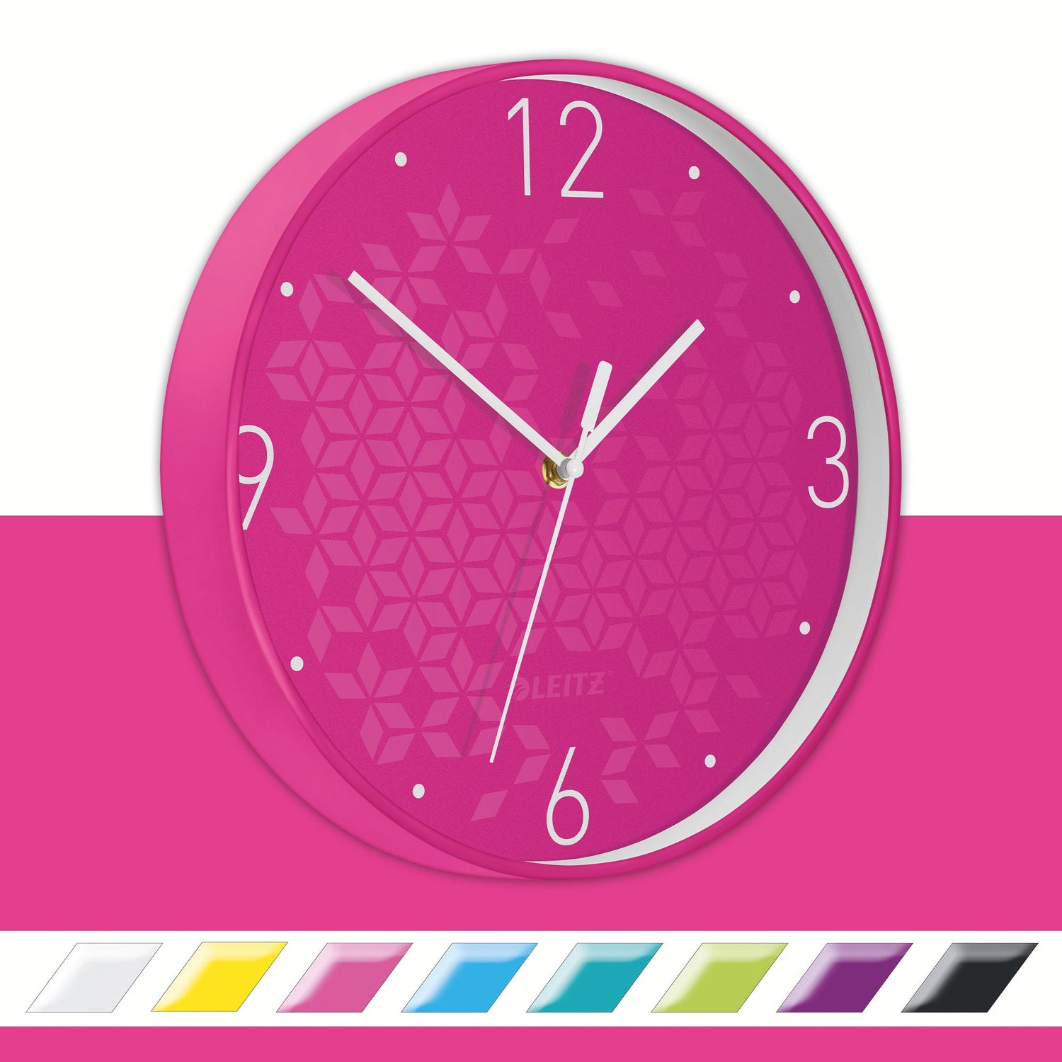 Stille vægur i iøjnefaldende WOW farver. 29 cm i diameter med en tofarvet ramme lavet i robust plastik kombineret med et glas front. Man kan ikke høre uret tikke, hvilket gør det ideelt til kontorer, studieområder eller i soveværelset. - En del af Leitz WOW - et bredt produktsortiment til organisering på kontoret og på farten i iøjnefaldende farver med et sofistikeret design, som lader din personlighed skinne igennem - Diameter 29cm - Stille bevægelse af viserne - Konstrueret med robust tofarvet plastikramme med glasfront - Baggrund i WOW farver med geometrisk mønster og store tal - Tre hvide visere, som gør det let at aflæse tiden mod baggrunden - Hul, som gør det let at hænge uret op -Bruger 1 x AA batteri (ikke inkluderet)