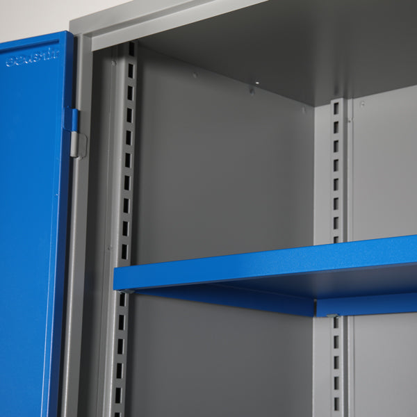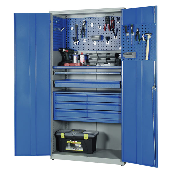 Stabilt, aflåseligt og helvejset værktøjsskab i meget robust stålkonstruktion. Størrelse er (h x b x d) 2000 x 1020 x 540 mm, kapacitet er 120 kg for faste hylder og 30 kg for de flytbare. Leveres komplet med interiør, skabet er pulverlakeret grå RAL7035 med blå låger RAL5005. Skabet leveres med