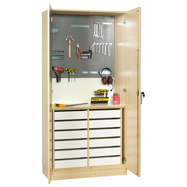 Værtøjsskab Mora med kabinet og døre i birk laminat. 12 skuffer med udtræk og værktøjstavle inkl. kroge og lister. Leveres med spanjoletlås. Leveres færdigmonteret.