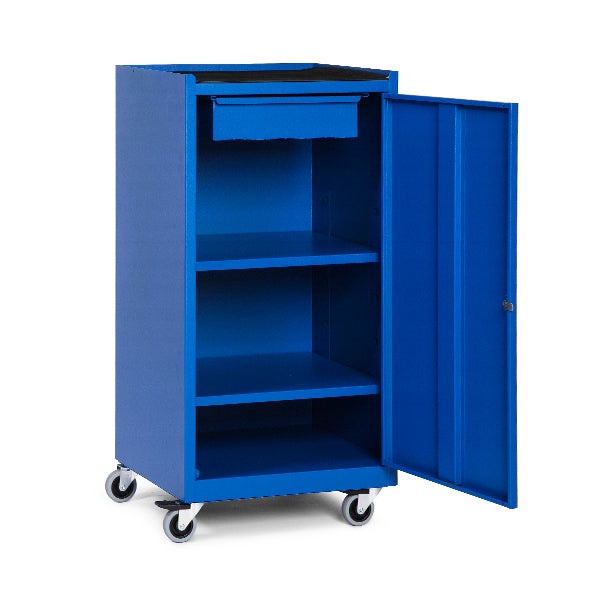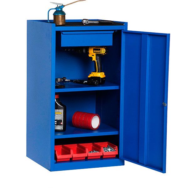 Værktøjsskab ErgoLite er et låsbart og meget anvendelig opbevaringsskab i størrelse b x d x h = 500 x 450 x 900 mm, som leveres med en indvendig hylde samt udtrækbar skuffe. Skuffen har indvendig mål b x d x h = 340 x 400 x 90 mm og kapacitet på 20 kg.Som tilbehør til GBP værkstedsskab kan du bestille skrivepult, ekstra hylde for indvendig placering, gummimåtte eller praktisk hjulunderstel med Ø75mm drejelige hjul. Leveres i blå.