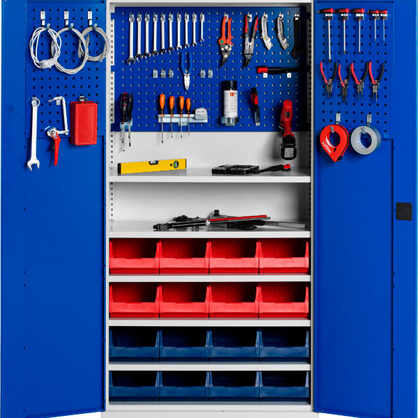 Skabet indeholder 1 værktøjstavle til ryg, 2 værktøjstavler til dør, 1 krogsæt med 56 kroge samt 16 plukkekasser (8 blå og 8 røde, hver på 11 liter).