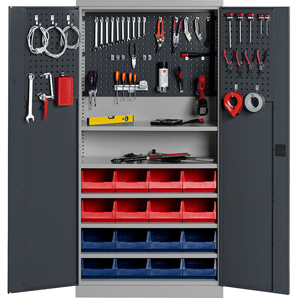 Skabet indeholder 5 flytbare hylder, værktøjstavle til ryg, 2 værktøjstavler til dør, krogsæt med 56 kroge samt 16 plukkekasser i blå og rød.