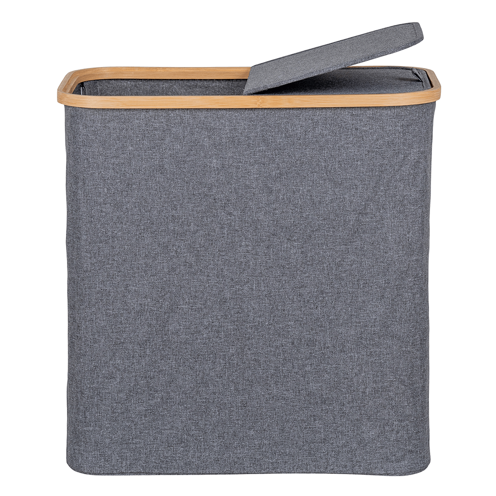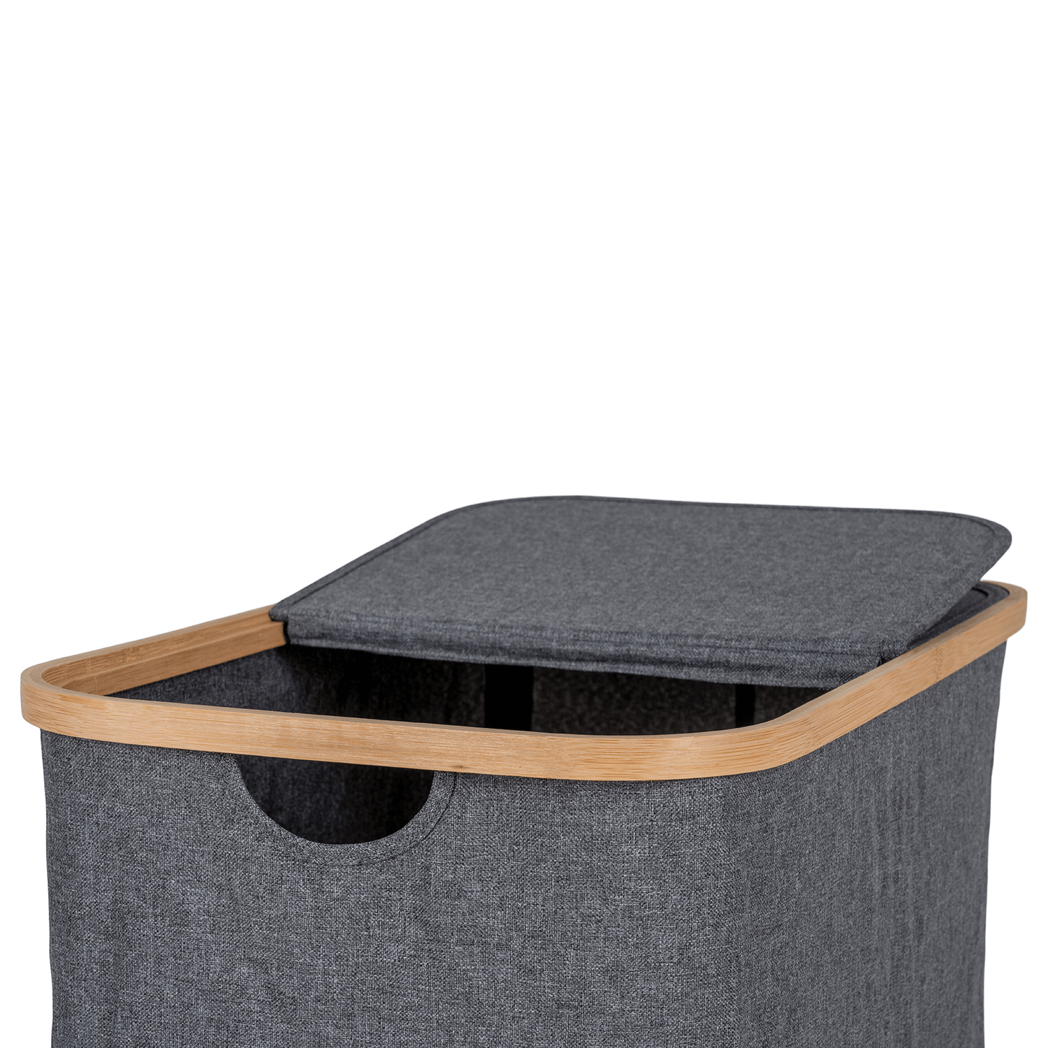 Vasketøjskurv i bambus med mørkegråt polyester stofHøjde: 54 cm. Længde 54 cm. Bredde: 33 cm.Lille, kompakt vasketøjskurv, der er let at finde plads til i soveværelse, badeværelse, børneværelse eller bryggers.