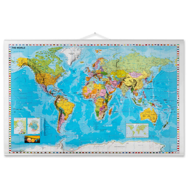 Stort verdenskort Farverigt verdenskort til væggen med ridsefast overflade. Landene er tydeligt afmærket i forskellige farver, og kortet er fyldt med detaljer såsom lande- og bynavne, tidszoner samt længde- og breddegrader. Teksten er på engelsk, og langs kortets kant pryder flag fra verdens forskellige nationer. Verdenskortet er perfekt til væggen på kontoret, gæsteværelset eller entreen, hvor det både fungerer som dekoration og læringsværktøj. Kortet er lamineret og har en praktisk skriv- og visk-ud funktion, der gør det muligt at skrive eller markere direkte på overfladen med kridt markere eller almindelige whiteboard-tuscher. Når teksten er tør, kan den nemt fjernes med en mikrofiberklud. Verdenskortet leveres med metalskinner i top og bund, hvilket sikrer, at det hænger flot og fladt mod væggen. Øverst sidder en ophængssnor, som gør det nemt at hænge kortet op på et søm eller en skrue. Verdenskortet leveres rullet i et beskyttende paprør og måler 137 x 89 cm, når det er foldet ud. Se hele udvalget af verdenskort og europakort.Gør din væg til en visuel rejse rundt om jorden med dette detaljerede verdenskort! Det er ikke bare et smukt pynt til din væg, men også en samtalestarter og et pædagogisk værktøj. Vent ikke! Forkæl din nysgerrighed og drømme om at udforske verdenen med dette farverige verdenskort.