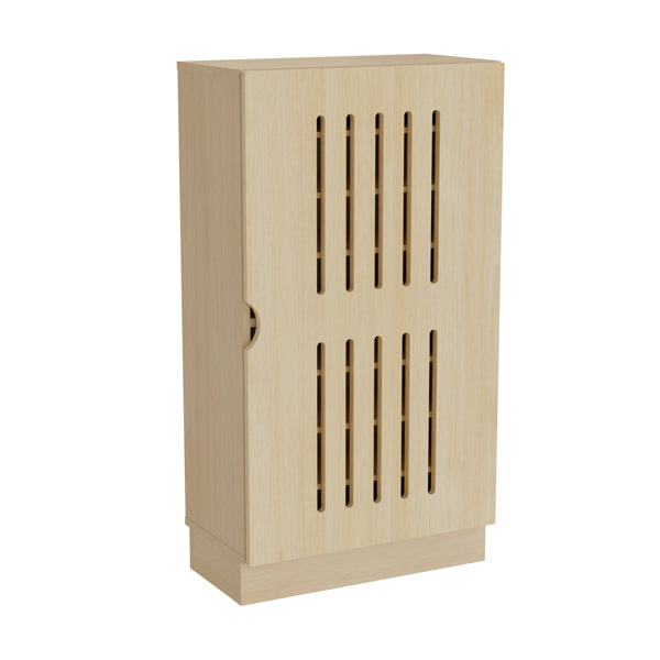 Pude- og tæppeskab med kabinet i laminat og døre i birk finér, med plads til 8 puder eller tæpper. Spor i døre, som giver god ventilation.