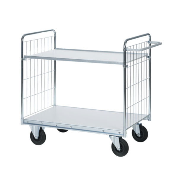 Hyldevogn er en robust vogn, som anvendes, når afstanden er længere. Store hjul, heraf 2 faste, gør vognen let rullende selv ved tung belastning. 2 hylder med trinløs justering af hylder og håndtag. Hylder med 10 mm slingrekant på langsiderne. Maksimalbelastning på 300 kg. Dim: 1030x650x990 mm.Specifikationer: