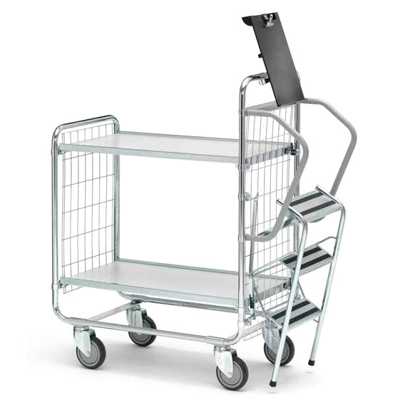 Plukkevogn med 2 hylder og stige sørger for, at du kommer 600 mm op fra gulvet, kan nemt slås sammen og foldes automatisk ud igen. Blyantholder og skriveunderlag medfølger. Maksimalbelastning på 200 kg, overhyldens maksimalbelastning er 100 kg. Dim: 1120x460x1270 mmSpecifikationer: