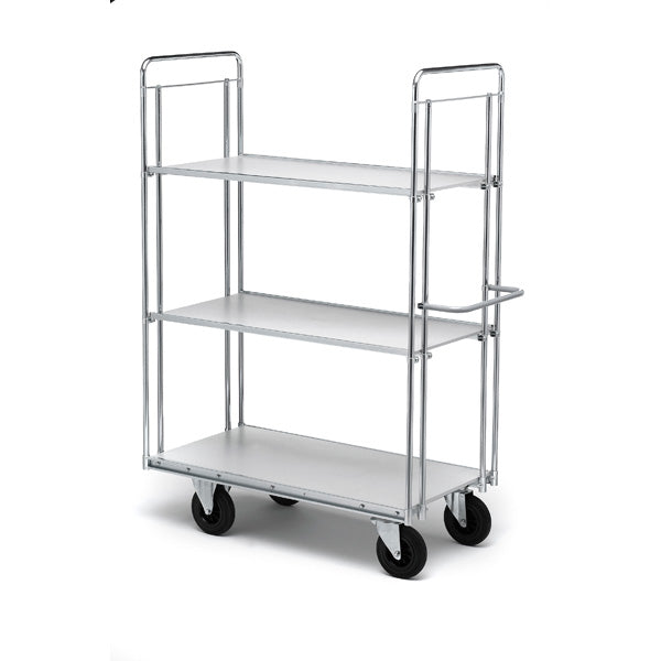 - Tre hylder giver overskuelig transport og midlertidig opbevaring af emner i lager, produktion og værksted. - Åbent hyldedesign sikrer hurtigt overblik og nem adgang under pluk og påfyldning. - Velegnet til intern logistik, hvor forskellige varer kan fordeles på flere niveauer for at effektivisere arbejdsgange.