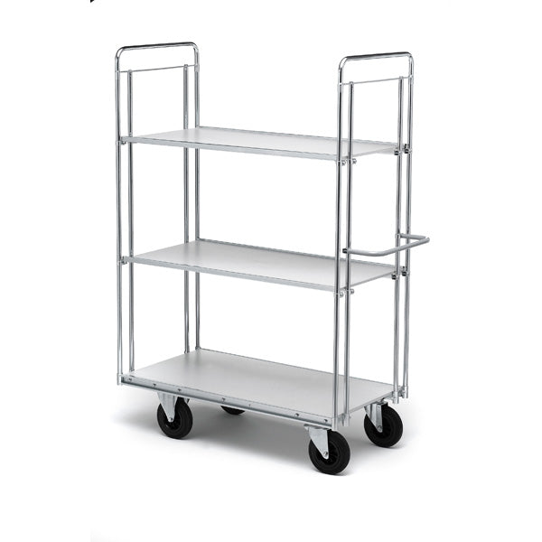 Velegnet til plukruter, intern logistik og forsyning af arbejdsstationer på lager og i produktion. Tre hylder gør det nemt at holde varer adskilt og øger mængden, der kan flyttes pr. tur. Den smalle bredde passer godt i gangarealer mellem reoler.