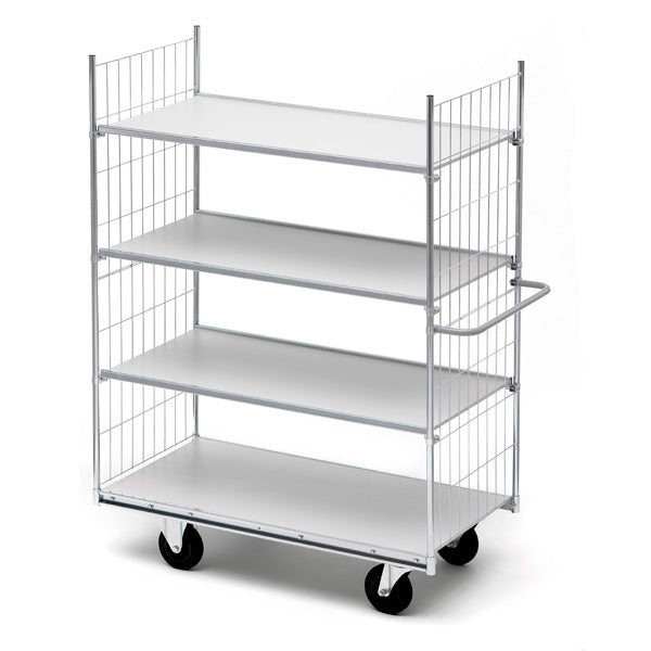 - Velegnet til intern transport og pluk i lager, værksted og produktion. - De fire hylder udnytter højden og muliggør organiseret håndtering og transport af flere emner pr. tur. - Mål: 1690x650x1390 mm.