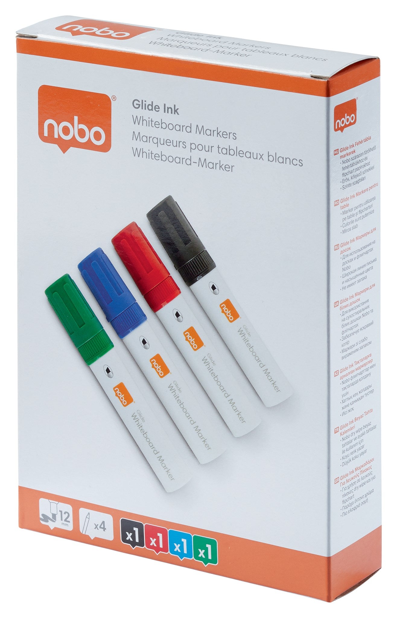 Glide jumbo whiteboard markere giver tykke og jævne linjer på whiteboards og andre ikke-porøse overflader som glas og emaljerede overflader. Disse non-permanente whiteboard tusser tørrer hurtigt og har blæk, som har en svag lugt. Tilgængelig i en række farver, så der er en farve til alle præsentationsbehov. De er ideelle til skoler, kontoret og hjemme. Pakken indeholder 4 markere med hurtigttørrende blæk med en bred skrå spids og 10 mm skrivebredde. Brug med et Nobo whiteboard for optimal præstation. - Whiteboard marker med blæk med svag lugt og i klar farve, som er tydelig at se på whiteboards - Brugbar på de fleste ikke-porøse overflader inklusiv glas, emalje og melamin whiteboards - 10 mm bred skråtskåret spids whiteboard pen - Pakke med 4 whiteboard markere
