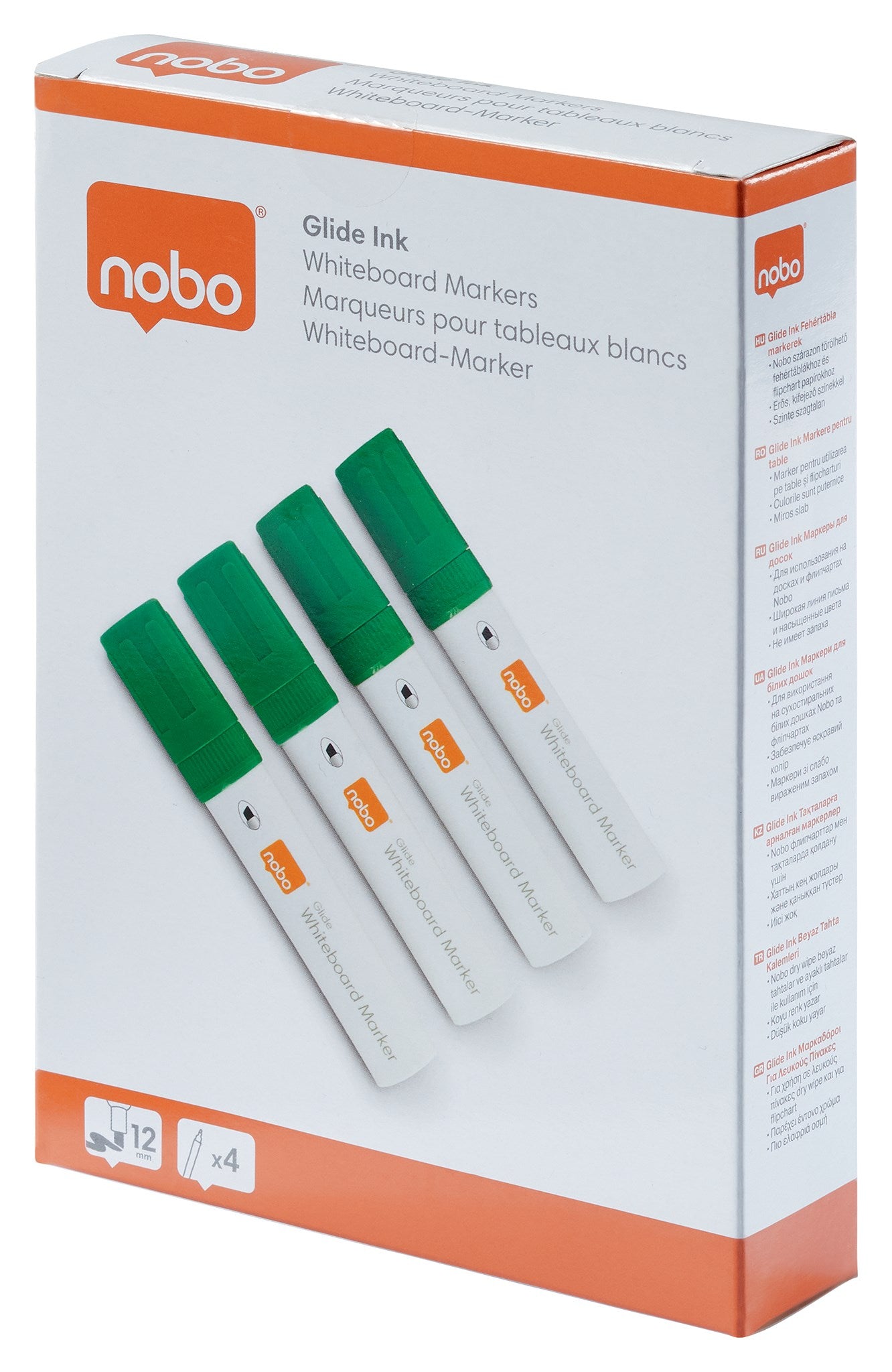 Glide jumbo whiteboard markere giver tykke og jævne linjer på whiteboards og andre ikke-porøse overflader som glas og emaljerede overflader. Disse non-permanente whiteboard tusser tørrer hurtigt og har blæk, som har en svag lugt. Tilgængelig i en række farver, så der er en farve til alle præsentationsbehov. De er ideelle til skoler, kontoret og hjemme. Pakken indeholder 4 markere med hurtigttørrende blæk med en bred skrå spids og 10 mm skrivebredde. Brug med et Nobo whiteboard for optimal præstation. - Whiteboard marker med blæk med svag lugt og i klar farve, som er tydelig at se på whiteboards - Brugbar på de fleste ikke-porøse overflader inklusiv glas, emalje og melamin whiteboards - 10 mm bred skråtskåret spids whiteboard pen - Pakke med 4 whiteboard markere