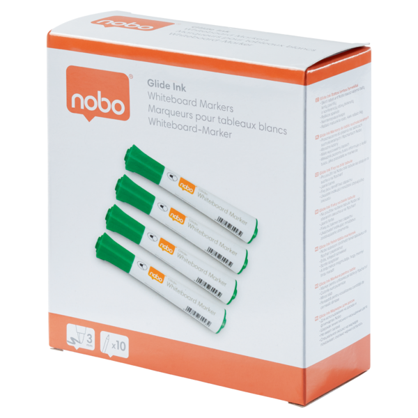 Glide whiteboard markere giver tykke og jævne linjer på whiteboards og andre ikke-porøse overflader som glas og emaljerede overflader. Disse non-permanente whiteboard tusser tørrer hurtigt og har blæk, som har en svag lugt. Tilgængelig i en række farver, så der er en farve til alle præsentationsbehov. De er ideelle til skoler, kontoret og hjemme. Pakken indeholder 10 markere med hurtigttørrende blæk med en rund spids og 2 mm skrivebredde. Brug med et Nobo whiteboard for optimal præstation.