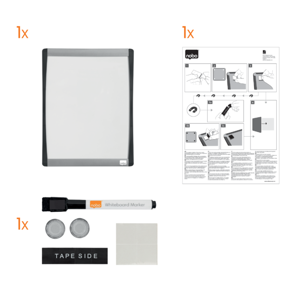 - Leveres med en whiteboardpen med viskerhætte, tavlemagneter, klæbende monteringspuder og magneter