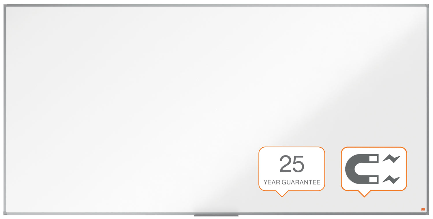 Emaljeret magnetisk whiteboard med anodiseret aluminiumsramme. Monteres til væggen gennem hjørnerne og leveres med en whiteboard-pennebakke. Den emaljerede magnetiske whiteboardoverflade giver en uovertruffen slet- og holdbarhed ved hyppig brug. Størrelse: 240x120cm. - Magnetisk emaljeret whiteboardoverflade giver overlegen sletbarhed. Til hyppig brug - Størrelse: 240x120cm - Omkranset af en anodiseret aluminumsramme - Fastgøres ved vægmontering gennem hjørnerne - Komplet med whiteboard pennebakke - 25 års garanti på overfladen