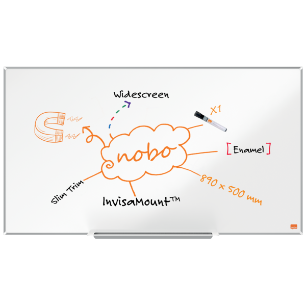 Emaljeret magnetisk whiteboard i widescreen format med tidssvarende smal og diskret ramme, der giver en mere tilgængelig og optimal skriveoverflade. InvisaMount™ systemet gør installationen nem, og monteringen er pænt skjult bag tavlen. En stilfuld whiteboard pennebakke til opbevaring af whiteboard markere og tavleviskere er medleveret. Den emaljerede magnetiske whiteboardoverflade giver en uovertruffen slet- og holdbarhed ved hyppig brug. Størrelse 89x50cm.
